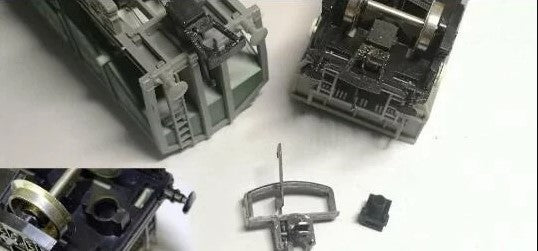 To remove the old coupling, simply pull and release the clip. When fixing the new NEM converter, first remove it from the sprue and ensure that it fits correctly in the designated hole. Once you are satisfied with the fit, apply a small drop of epoxy glue to the large 3mm shaft and firmly push it into the hole.
